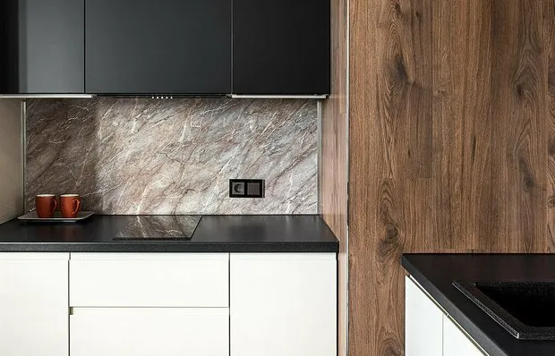 Diseño: Anna MorozovaCasi toda la mobiliario es de producción rusa. La taller de carpintería reemplazó las puertas antiguas de la cocina por nuevas, aumentó el espacio de almacenamiento y amplió la sección izquierda, permitiendo elevar el horno microondas. A pesar de eso, la encimera de piedra acrílica la dueña dejó de la cocina anterior.