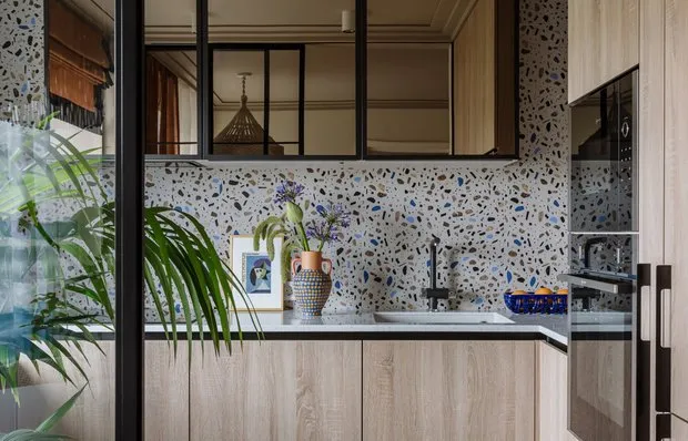 El apartamento se vendía sin planos, lo que permitió organizar el espacio exactamente como deseaba la dueña: con una zona social cómoda, construida siguiendo el concepto de estudio, ideal para compartir con amigos. Al mismo tiempo, por las tardes, el interior puede convertirse en una zona más privada para relajarse y prepararse para un nuevo día.