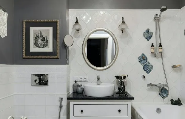 Para distraer la atención del pequeño espacio del baño, la diseñadora Oksana Oleynik decidió usar azulejos con diseño. Para el suelo eligió un tipo más activo y contrastante de cerámica negra y blanca, mientras que para las paredes usó cuadrados blancos con un diseño geométrico más elegante. La zona del lavabo y espejo se destacó con azulejos de pequeño formato en color vertical. Todos los accesorios y elementos de fijación son negros.