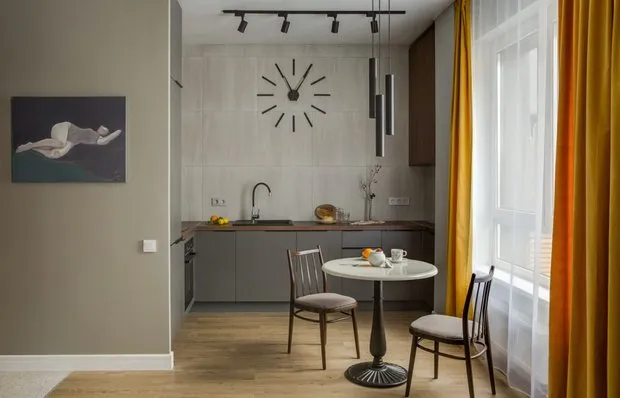 Para la cocina de paso se diseñaron nichos a ambos lados. Para ahorrar, el ancho se calculó para los armarios estándar. Un lado tuvo los altos armarios-columnas, el otro la zona de trabajo.