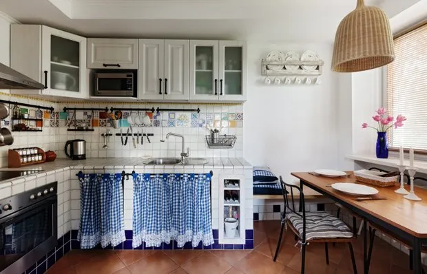 Excelente organización de almacenamiento en cocina con estilo provenzal