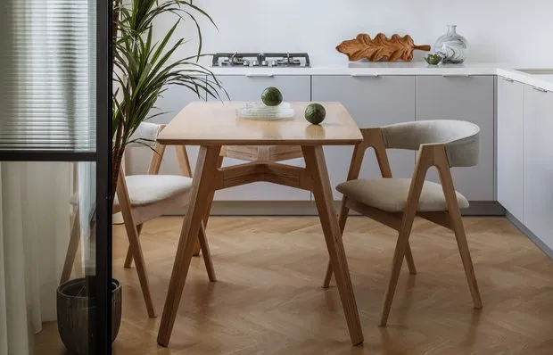 La diseñadora Anna Akshesvskaya decoró el apartamento para la madre del cliente, combinando funcionalidad máxima y estética contemporánea en el diseño. Tras la reforma se logró una cocina-sala de estar más espaciosa, manteniendo la presencia de dos habitaciones: para ello se hizo una ventana-feria entre los espacios. En la decoración apostaron por materiales naturales, una gama de colores cálidos y acentos vibrantes.