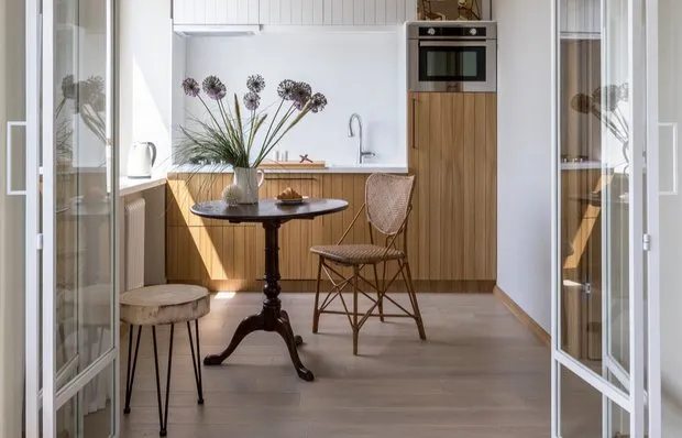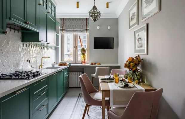 La diseñadora María Katarian decoró el interior en estilo "vieja Moscú". El resultado fue un espacio luminoso con detalles coloridos, lleno de luz natural y una cocina sin estantes superiores, sillas venecianas clásicas y azulejos blancos cuadrados.