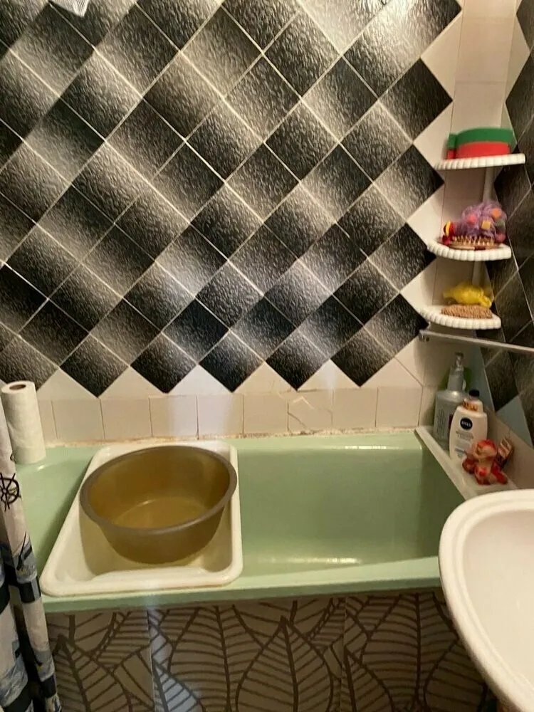 Se retiró completamente la antigua superficie, se reemplazó la sanitaria. Se combinó azulejo de gran formato en tono cálido beige con azulejo que imita la madera y hexágonos alargados en tono azul. El resultado fue bonito y aireado.