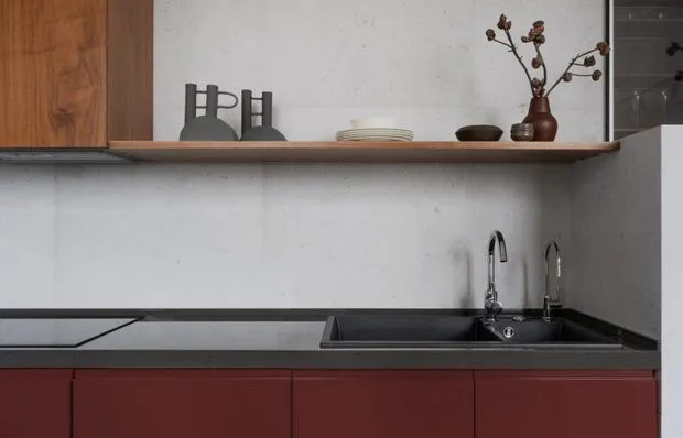 Para la decoración de la cocina eligieron cerámica granítica de gran formato en el delantal y el suelo, los muebles inferiores se pidieron en madera de caoba, los superiores — blancos. Parte de los muebles superiores se sustituyó por una repisa abierta de madera. Gracias a esto, el conjunto no parece excesivamente espacioso.