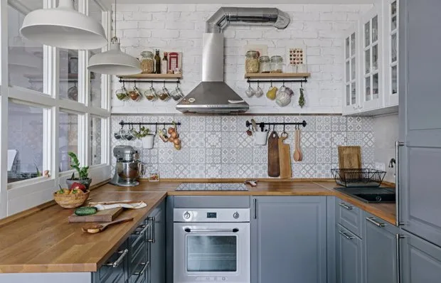 Ladrillo, concreto, madera: cocina-estancia en las mejores tradiciones del estilo loft