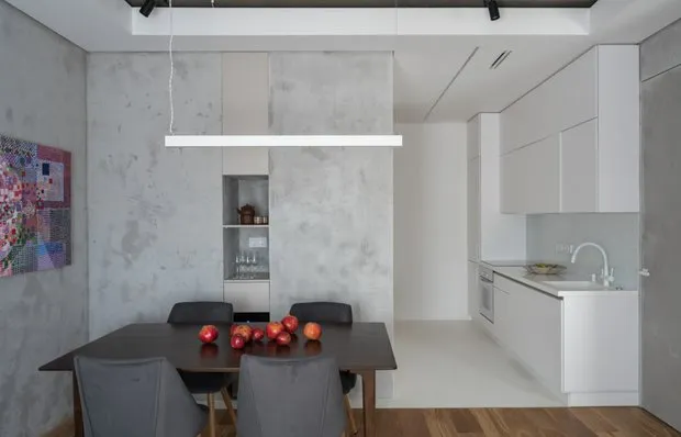 La arquitecta-diseñadora Ekaterina Pimkina creó un proyecto de cocina-estancia de 60 m² para una familia con un niño. Una de las principales tareas fue organizar una cocina-estancia espaciosa y funcional que sea adecuada tanto para el tiempo libre familiar como para recibir a invitados. La distribución se decidió de inmediato: un sistema lineal, una mesa para comedor y un sofá, incluso se previó un biohogar. Sin embargo, la decoración se eligió entre dos opciones igual de atractivas y llamativas.