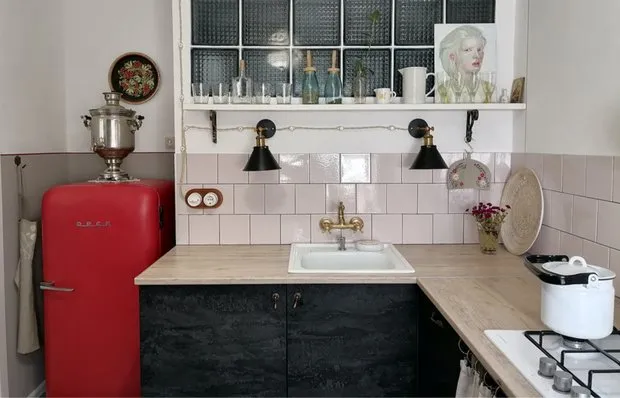 Las bandejas están hechas de MDF Kronospan. Sistemas de almacenamientoLa cocina destaca por su almacenamiento muy pensado. La diseñadora ideó tanto secciones de almacenamiento cerradas como estantes abiertos donde puedes colocar algo bonito. Para mayor comodidad se insertó una iluminación LED controlada por sensor.