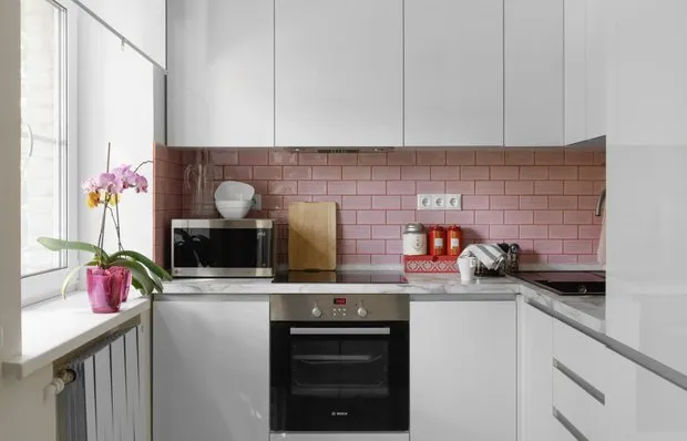 Ekatrina Jolodkova compró un apartamento de una sola habitación en un edificio de estilo хрущёвka construido en 1964 y realizó una reforma sin necesidad de un diseñador. Como resultado, con un presupuesto limitado se logró una cocina mini sin armarios superiores y con almacenamiento no estándar.