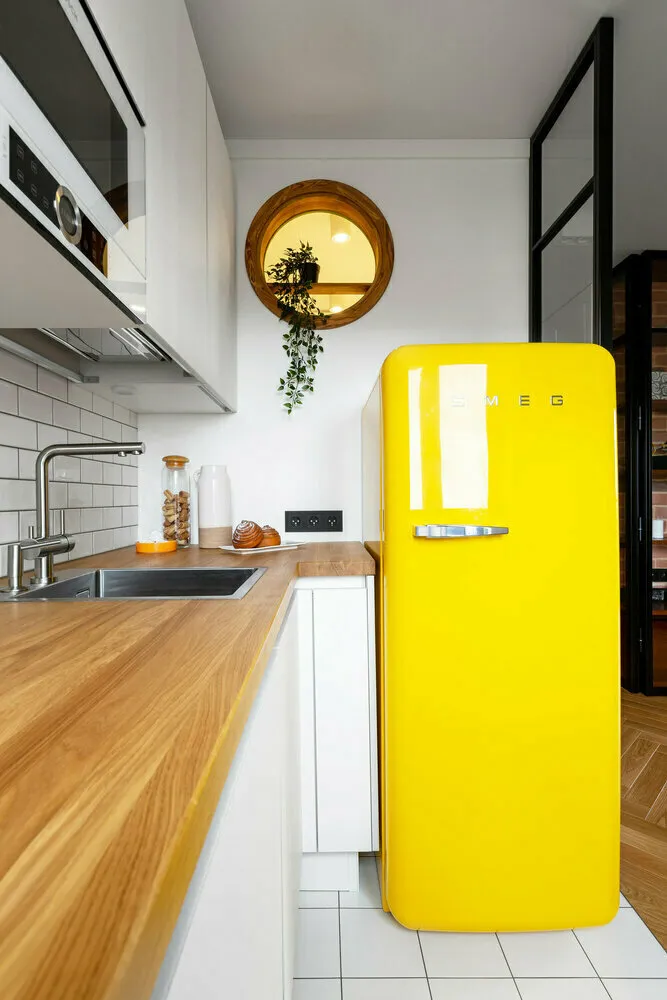 Para evitar que la mobiliario parezca voluminoso, elige fachadas con vidrio, especialmente si planeas almacenar libros o platos bonitos. También puedes esconder un aire acondicionado tras una fachada con fresado, como hizo el diseñador en este proyecto.