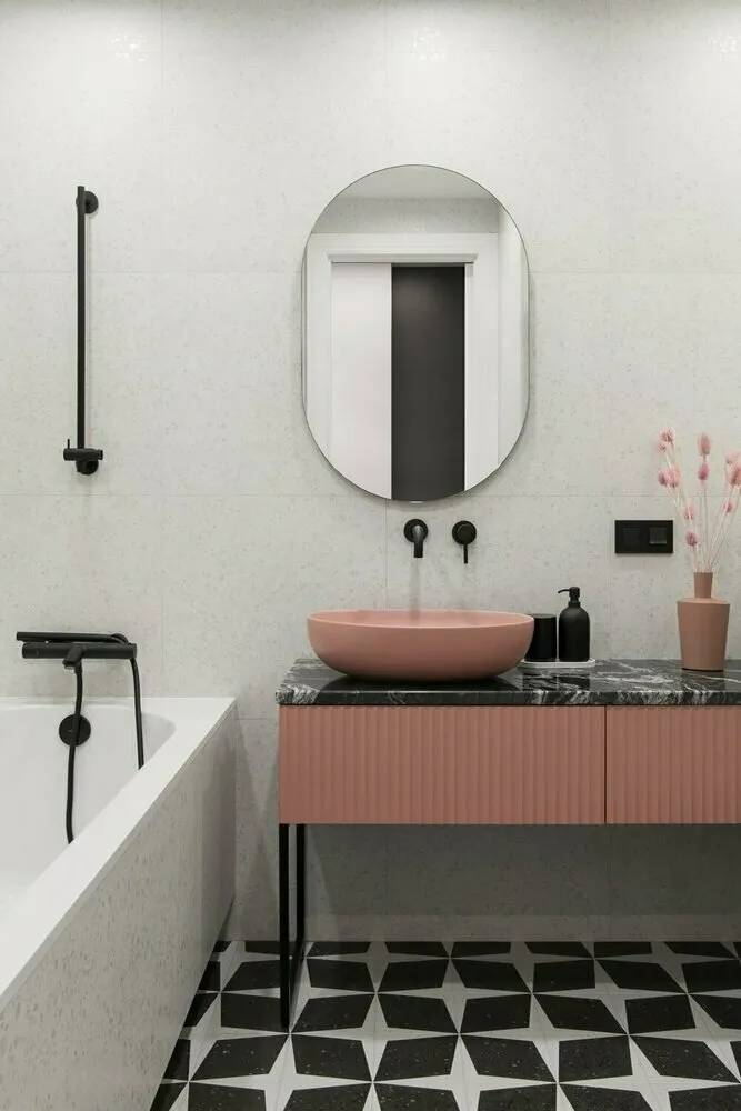 Y finalmente llega el momento de los muebles, decoración y otros accesorios: aquí cuelgas el espejo (mejor elegir modelos con iluminación y calentamiento para evitar la condensación), colocas estanterías, armarios, cuelgas toallas y cortinas, agregas accesorios.