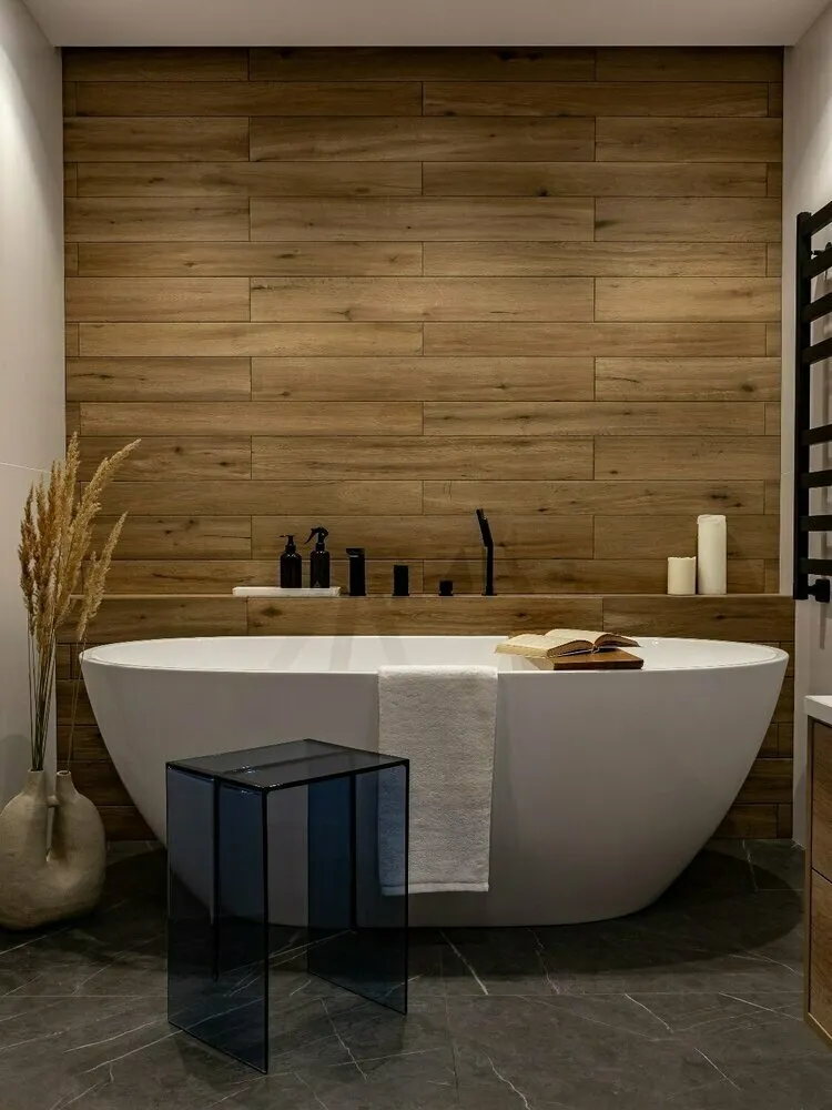 Si elegiste un baño, hay 4 tipos: acrílico, fundido de hierro, acero y mármol litado. Es mejor elegir mármol litado con su geometría ideal. Esto es necesario para colocar las baldosas con el mínimo espacio entre la bañera y las baldosas. Y también para hacer una pantalla recta — la unión entre la bañera y las baldosas será perfectamente recta.