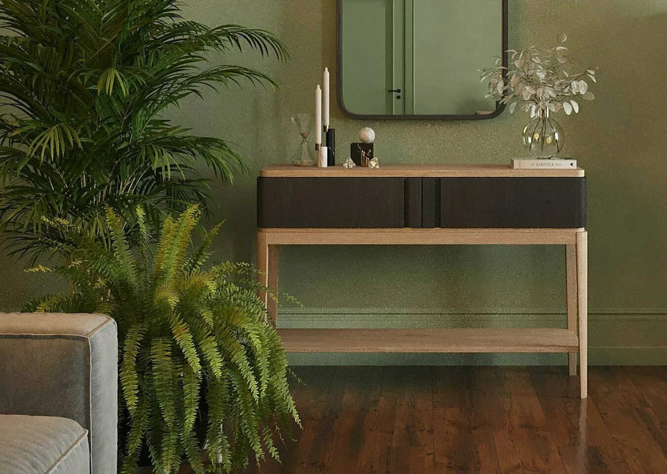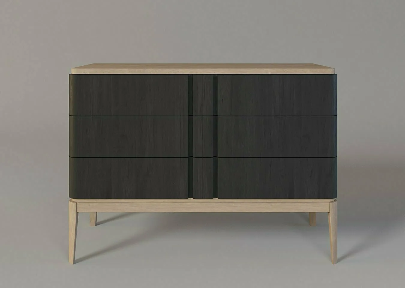 Es importante no solo comprar una buena cama en la habitación, sino también preocuparse por el almacenamiento. Si el espacio lo permite, organice una zona con un escritorio de baño en la habitación: perfecto para una consola color negro-beige con base de madera maciza de roble. El artículo decorativo se ajusta también para almacenar artículos importantes: puede colocar decoración en la superficie y guardar documentos u otros artículos en los cajones. Preste atención: en la colección hay más muebles de almacenamiento y organización inteligente del espacio.