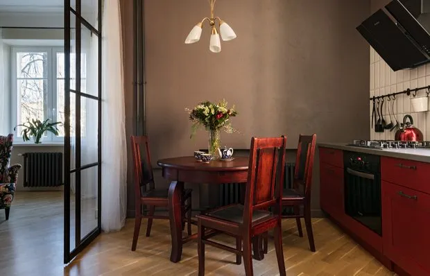 Una pared de la cocina fue revestida con azulejos hasta la mitad, esto protege la pared de daños causados por sillas donde se sientan los niños. El suelo está hecho con ceramogranito. Los molduras del suelo están hechas de durapoliéster, un material práctico que no deja marcas tras impactos.