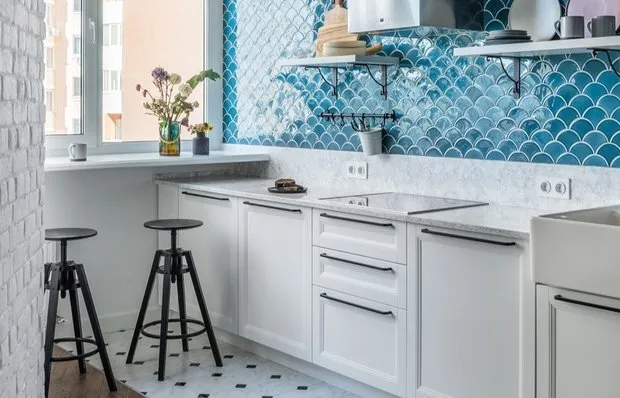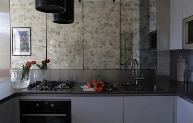 Delantal de 'escama de pescado', papel pintado diseñador, lámparas inusuales: decoración estilo trash 76 m²