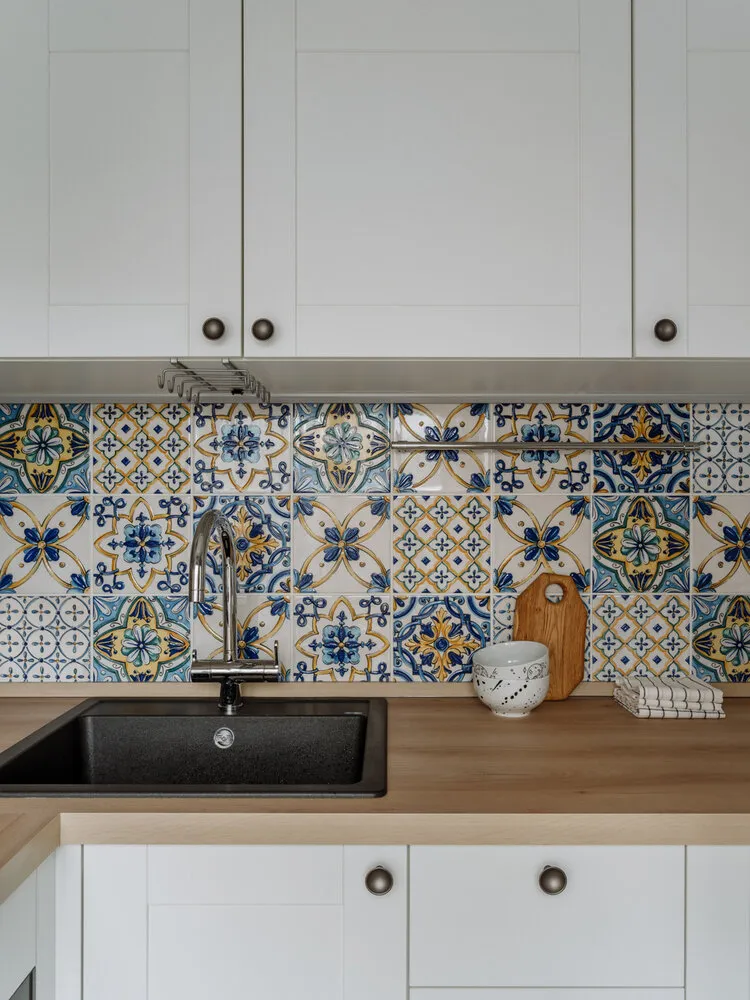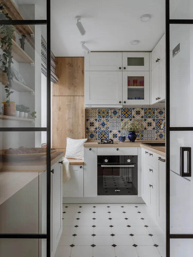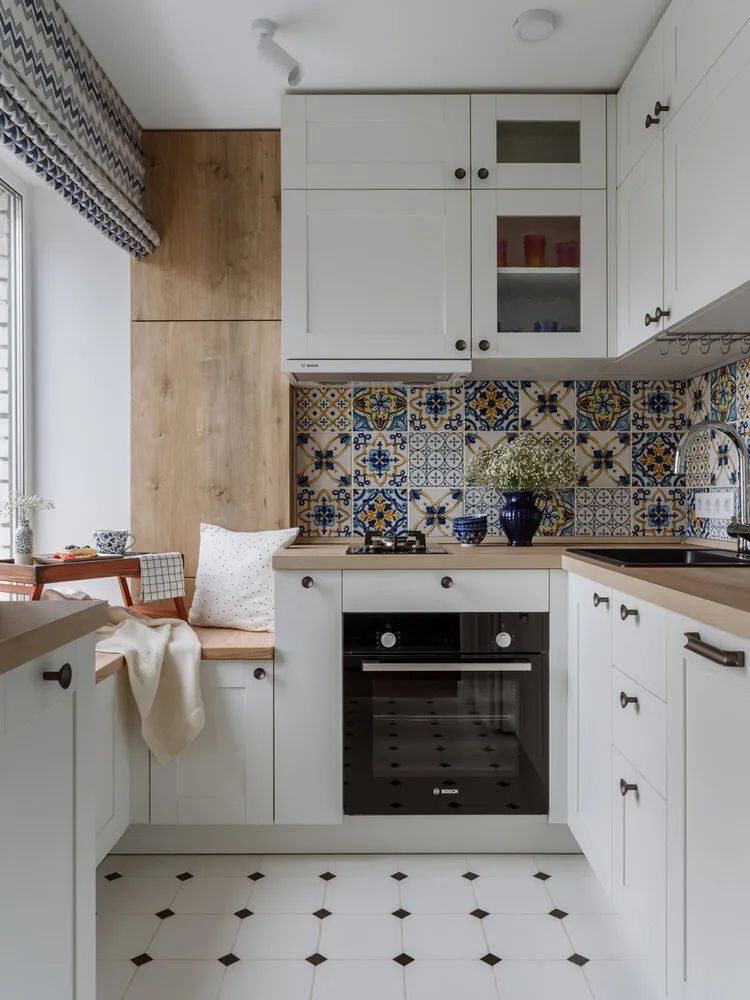 Para el fregadero eligieron una bonita baldosa con patrones que dieron atmósfera al conjunto completo de la cocina.Para aumentar la funcionalidad y una mayor decoración en la nicho colocaron un armario de cocina y colgaron estanterías abiertas — para hermosa vajilla y decoración.