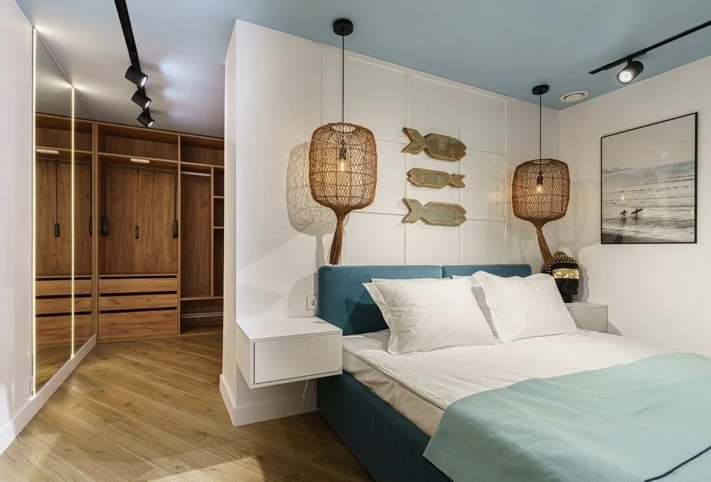 Se utilizaron materiales que evocan asociaciones con el cielo, el agua y la arena cálida. Se utilizó mucho decoración temática: desde tablas de surf y peces de madera hasta mesas tipo troncos. Todas las soluciones luminosas también tienen elementos naturales: por ejemplo, la lámpara en la sala de estar recuerda islas verdes.