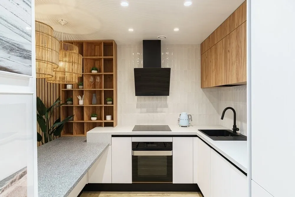 1. Una cocina P-shaped espaciosa con encimera de diferentes alturas y barra de barra;