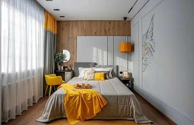 Diseño de dormitorio vibrante con gato en estilo clásico y pop-art