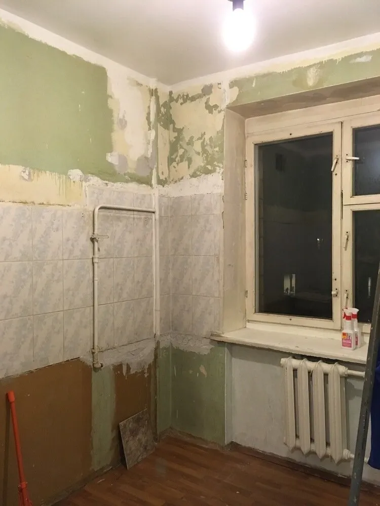 Foto de la cocina antes del remodeladoEl conjunto de cocina se instaló linealmente — esto es IKEA. La encimera fue elegida de color blanco de piedra artificial con pequeños bordes. Se optó por una estantería abierta en lugar de los armarios superiores para decoración. Así el espacio parece más ligero y aireado.