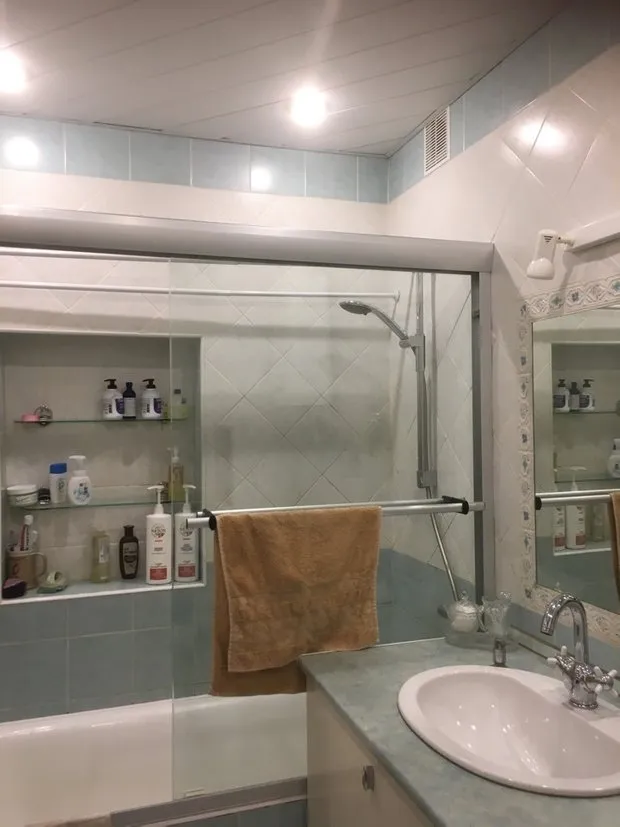 En el baño se reubicó el inodoro y se modificaron las proporciones del espacio detrás de la bañera. Se hizo más ancha y más baja, mejorando su ajuste a las dimensiones de la bañera. También se fabricó un armario funcional oculto con paneles pintados en color gris donde se guardaron las instalaciones, el colector de tuberías y un espacio para almacenar productos químicos domésticos.