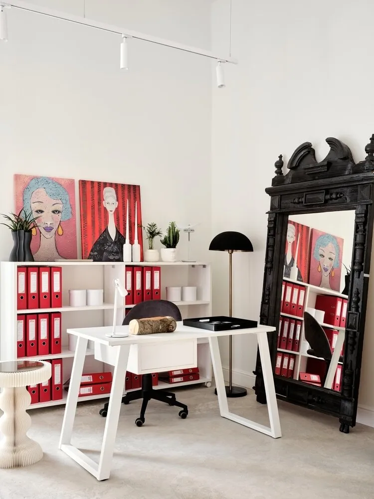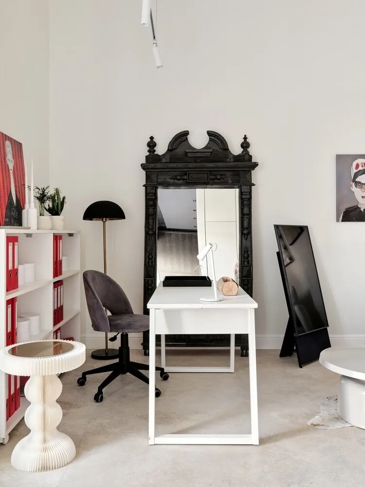 Un área de trabajo es necesaria incluso en un pequeño espacio residencial. Fue organizada con estanterías abiertas para libros y documentos, una mesa de trabajo y una silla cómoda. Como elemento contrastante interesante se agregó un espejo con marco tallado antiguo, restaurado y pintado en negro.