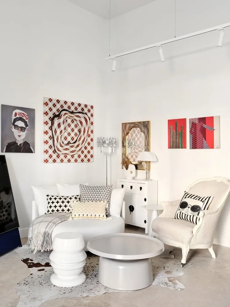 En el diseño de la vivienda, el estilo y la atmósfera se definen mediante diversos elementos como muebles, iluminación y decoración. El diseñador le dio especial importancia a los elementos eclécticos que dan identidad al conjunto. Aquí, un sofá moderno se combina con un sillón clásico, almohadas con diferentes estampados, mesas de café elegantes y obras artísticas vibrantes.