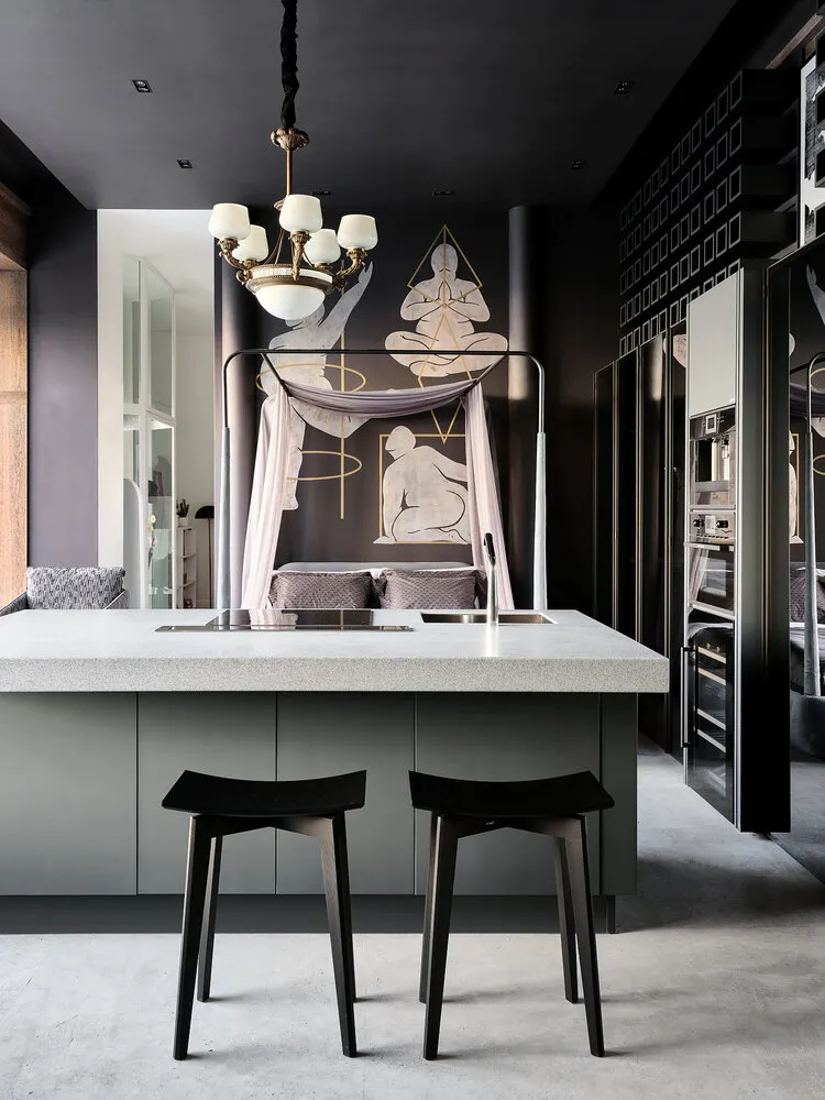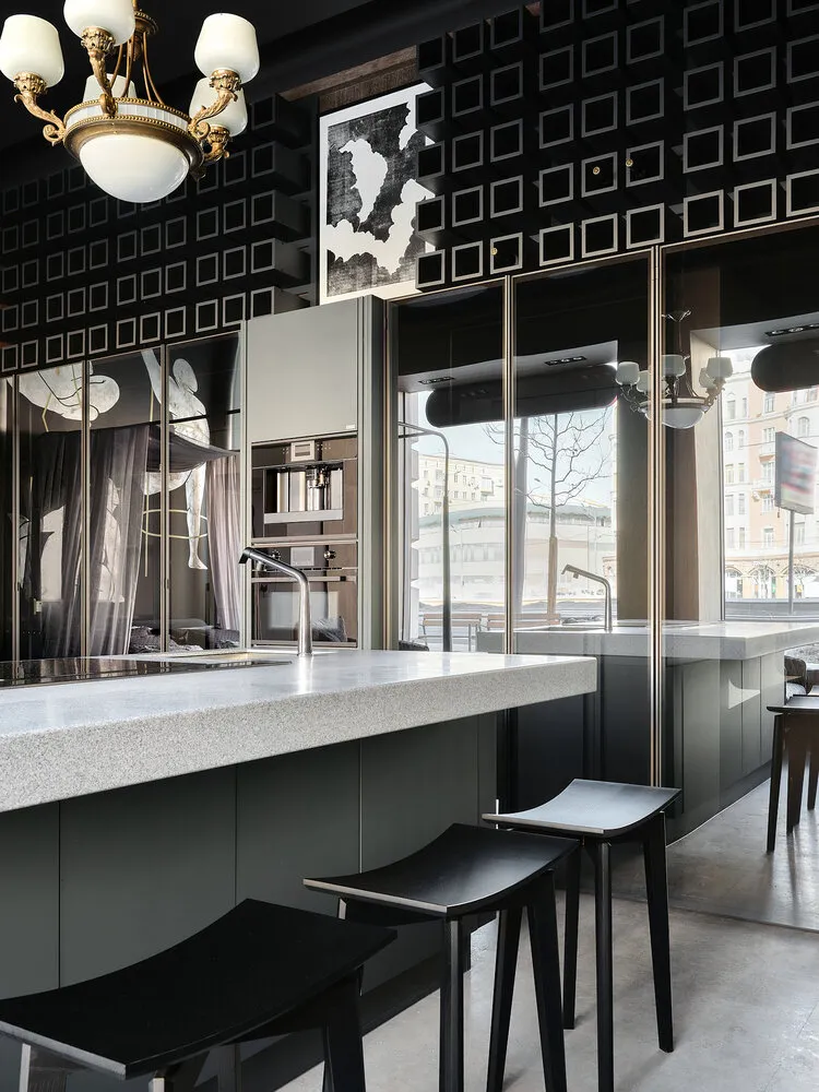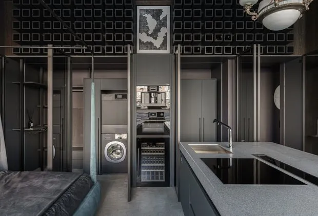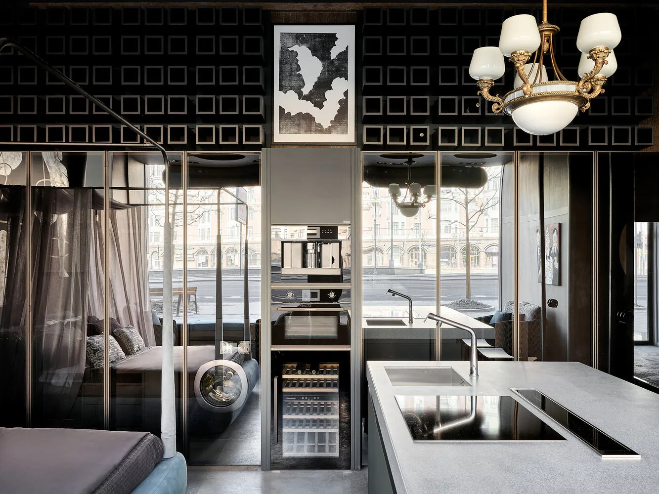 El diseño del interior se basa en contrastes y combinaciones de elementos provenientes de diferentes «mundos». Por ejemplo, la cocina de alta tecnología en estilo minimalista está junto a una lámpara antigua inspirada en el estilo estalinista. La decoración y la paleta de colores del artefacto se reflejan en el patrón de los papel pintado, son esas pequeñas piezas que unen todo el espacio.