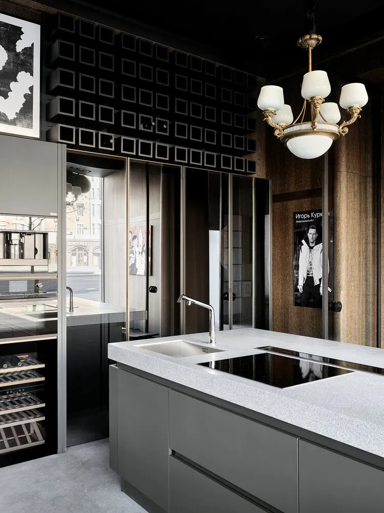 Todas las systemas de almacenamiento están ocultos tras fachadas de cristal: al dueño no hay nada que esconder, todo lo muestra a la vista.El dueño de la vivienda lleva una vida activa, no cocina regularmente sino solo cuando le da la gana. Por eso el conjunto de la cocina está totalmente integrado en el diseño general. El refrigerador y los almacenes están escondidos tras las fachadas de cristal de los muebles en la nicho, todos los electrodomésticos necesarios están colocados en el islote.