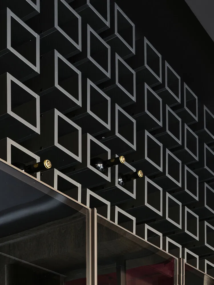 Las estanterías de la bodega se colocan encima de los vitrines de cristal. No solo son funcionales sino también decorativas ya que enmascaran un sistema de ventilación bastante imponente.
