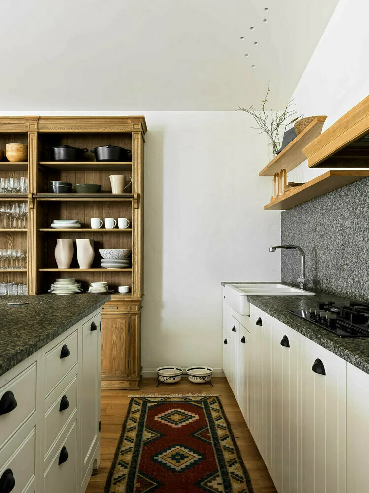 Otra solución interesante ideada en la cocina: las puertas oscuras se colocaron en la parte superior, decorando también el delantal con una placa negra. Por lo general, los diseñadores hacen lo contrario, pero aquí Marcel logró un efecto original: las puertas superiores se integraron en la pared. La mobiliario con formas rectas equilibró el interior y ayudó a destacar los contrastes entre calidez y rigidez, mientras que en la habitación principal se aumentó visualmente el espacio con los armarios y techos blancos.