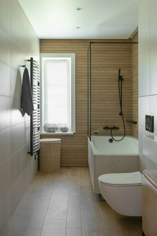 En las habitaciones de vida se usó parquet, en la entrada y cocina se usó ceramogranito. Ambos materiales rara vez perderán su relevancia en los próximos años y son convenientes para uso diario. La casa tiene dos baños: en el primer piso está la bañera con ventana, donde todos los artefactos están dispuestos en una sola pared — esto también es muy cómodo para el uso. En la bañera de fundición se previó iluminación por ambos lados — parece que flota sobre el suelo.