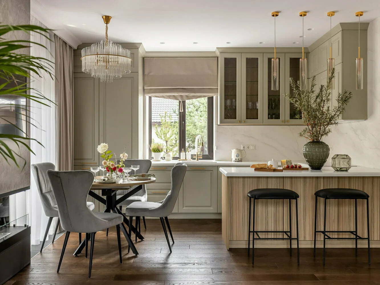 En una mitad del primer piso se decoró la sala de estar, cocina y comedor, mientras que en la otra se colocó el vestidor, estudio y baño visitante. En el segundo piso se creó la habitación infantil, dormitorio de los padres, dormitorio visitante y baño separado con lavandería. El diseñador conectó maravillosamente el interior con el exterior: desde las puertas panorámicas se veía el jardín verde, por lo que eligió una paleta adecuada para la cocina-sala de estar — fachadas oliváceas y sillas esmeralda.