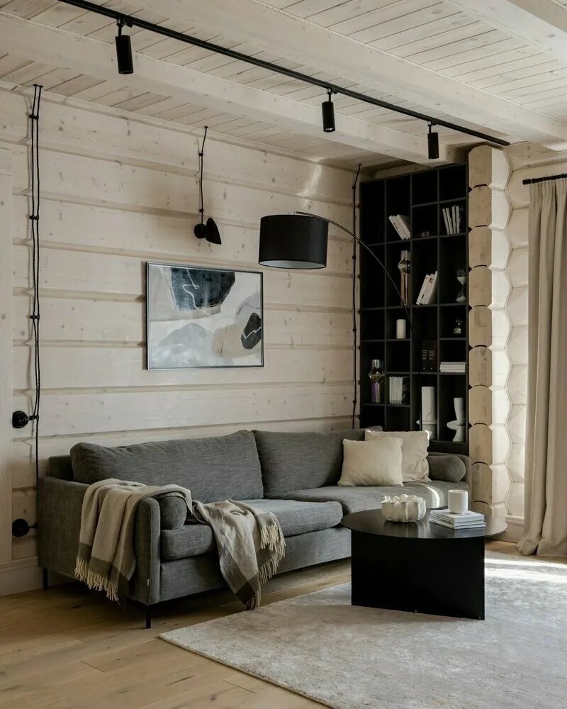El diseñador Julia Lyublyanova creó un interior de una casa de dos pisos para una familia con dos hijos. A los clientes les gustaba vivir en un espacio acogedor y funcional. La casa resultó exactamente así: para hacer que el interior se sintiera más aireado, las paredes de madera fueron pintadas con una pintura semitransparente. Los acentos se añadieron con el uso de muebles y acabados en color gris oscuro.