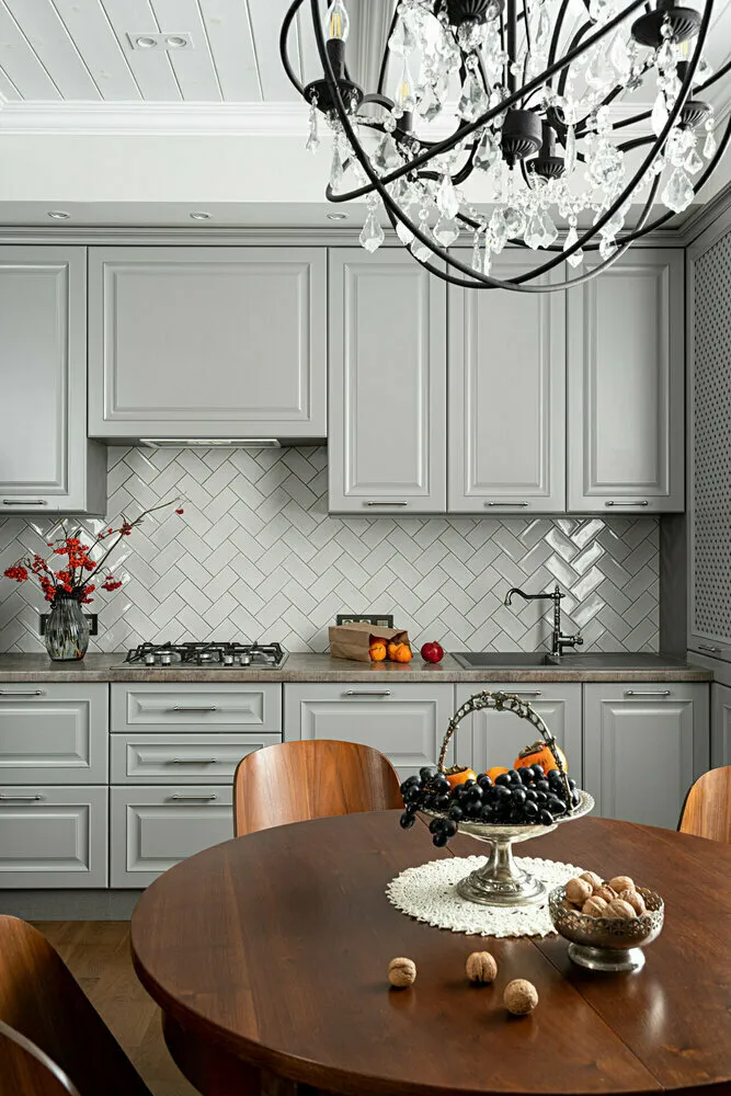 El zonado en la cocina-sala se hizo con geometría de techo césar, colocación correcta de mobiliario y luz. La zona de sala se destaca con un sofá suave y una silla, frente al grupo de comedor hay una vitrina. La cocina fue hecha a medida: no se pudo mover el calentador de gas — para este se hizo una carcasa con ventilación en la puerta.