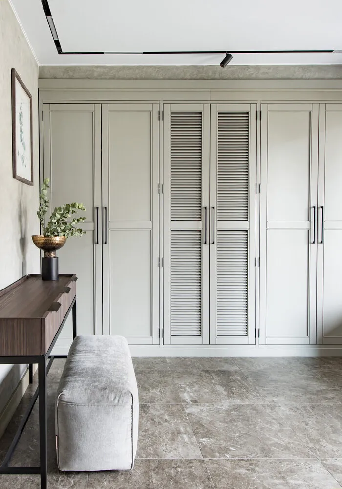 Los sistemas de almacenamiento integrados a menudo son más costosos, además hay que esperar hasta que se fabricen y monten en el lugar. En este proyecto encontraron una excelente alternativa: compraron un armario Dantone Home espacioso y con estilo, y construyeron una nicho de cartón seco para él, pintándola del color de las puertas. Al final, el armario luce como integrado y no queda espacio entre la mobiliario y el techo donde puede acumularse polvo.