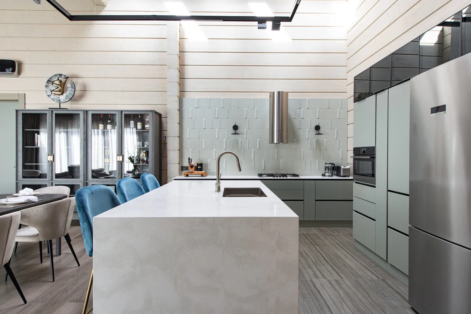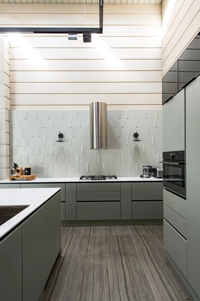 El horno de la cocina se colocó no bajo el encimero, sino en una columna separada en el centro. Esto facilita su uso - no se necesita agacharse para colocar los platos y verificar la cocción. Presta atención a que se instale el horno de manera que la pantalla y el panel de control estén a una altura no superior al nivel de los ojos ni por debajo del cinturón.