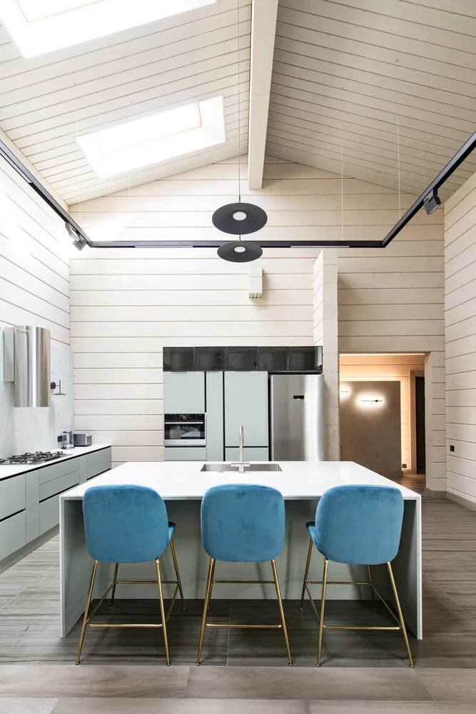 Además de grandes ventanas panorámicas en la cocina-comedor de esta casa, también instalaron ventanas de ático que permiten tener mucha luz natural. Para hacer su uso lo más cómodo posible, se eligieron con control eléctrico - se pueden operar con un control remoto o a través de una aplicación en el teléfono.