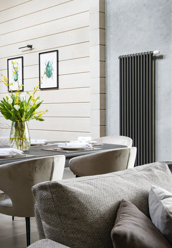 Los radiadores estándar a menudo son difíciles de integrar en el interior: se ven feos y llaman demasiado la atención. Por eso, los diseñadores cada vez más eligen modelos altos y tubulares que se convierten en un elemento destacado en el diseño. En este proyecto, la empresa WSL apostó por radiadores de color gris oscuro - se colocaron en la cocina-comedor y baños. Se ven elegantes y gracias a sus líneas verticales, visualmente elevan el techo.
