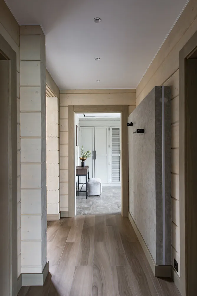 Para dar volumen a las habitaciones y añadir una luz suave adicional, los diseñadores de WSL previeron paneles con iluminación en el vestíbulo y corredor. Los marcos se hicieron con cartón seco, para su acabado eligieron estuco decorativo y colocaron iluminación alrededor. En el interior, esta solución luce con efecto, pero también con elegancia minimalista.