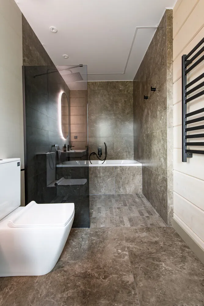 Para decorar el baño junto con la habitación principal se eligió un azulejo cerámico grande en tonos neutros. Para no dividir visualmente el espacio, la pantalla de la bañera se revistió con el mismo azulejo que las paredes. Como resultado, la zona de la bañera y la ducha parecen un solo bloque y el espacio parece visualmente más grande.