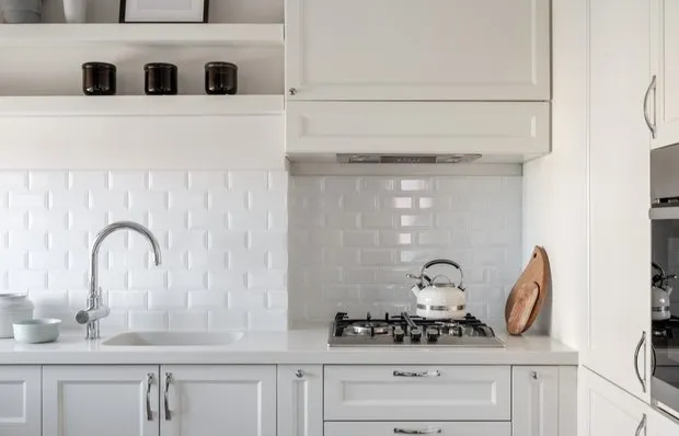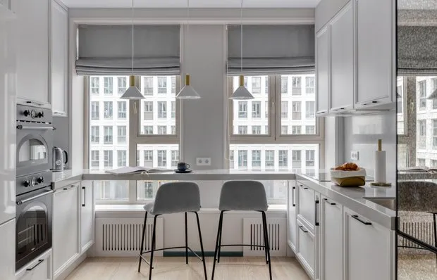 Cocina blanca de 8 m² en una típica dos habitaciones