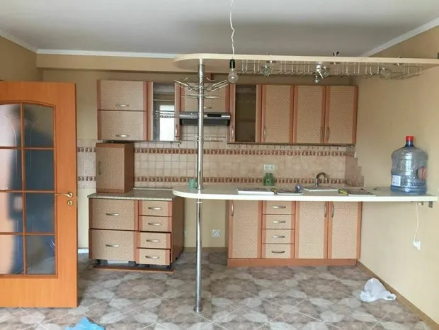Cocina antes del remanufacturadoEn el apartamento había una tubería de gas, por lo tanto, comenzaron el remanufacturado con su traslado más cerca de la ventana — se dejó acceso. La ventilación se colocó por encima del nivel de los demás armarios: así se debe hacer según las normas. El conjunto de cocina se elevó hasta el techo, hay una separación con drywall donde se ocultó el conducto de aire. En la cocina se previó una puerta corredera.