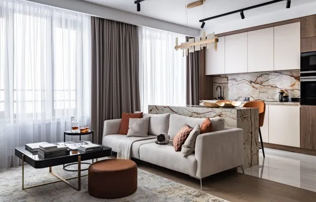 Estilo moderno de apartamento de dos habitaciones de 67 m² con tonos cálidos