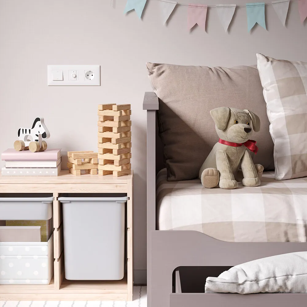 En la habitación infantil debe instalar tomas con protectores que impidan introducir objetos extraños en la toma. Estos son invisibles durante el uso normal. La ventaja de los protectores frente a las tapas es que se activan automáticamente, mientras que las tapas deben colocarse cada vez después de usar la toma.