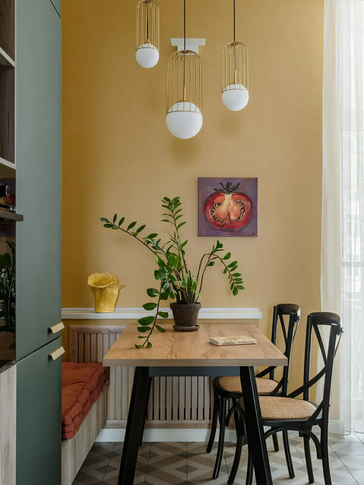 Diseño: Ekaterina LyubimkinaLas tonalidades oscuras de naranja o tonos amarillos ayudan a estimular la actividad: buen apetito y buen humor son garantizados.