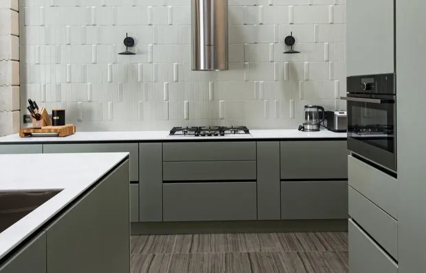 Las paredes principales se recubrieron con pintura. La pared con ventanas y la opuesta se decoraron con azulejos decorativos que imitan ladrillo para resaltar los altos ventanales arqueados. En el suelo de todos los espacios habitables se usó tablero de roble macizo.
