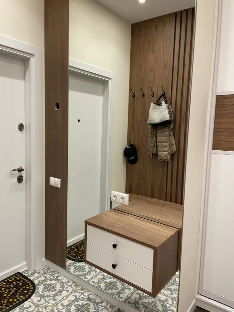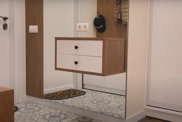 Almacenar cosas en el vestíbulo puede ser un problema: necesitas espacio tanto para ropa como para artículos útiles, pero sin sobrecargar el espacio con armarios. La solución es montar la consola colgante justo junto al espejo.