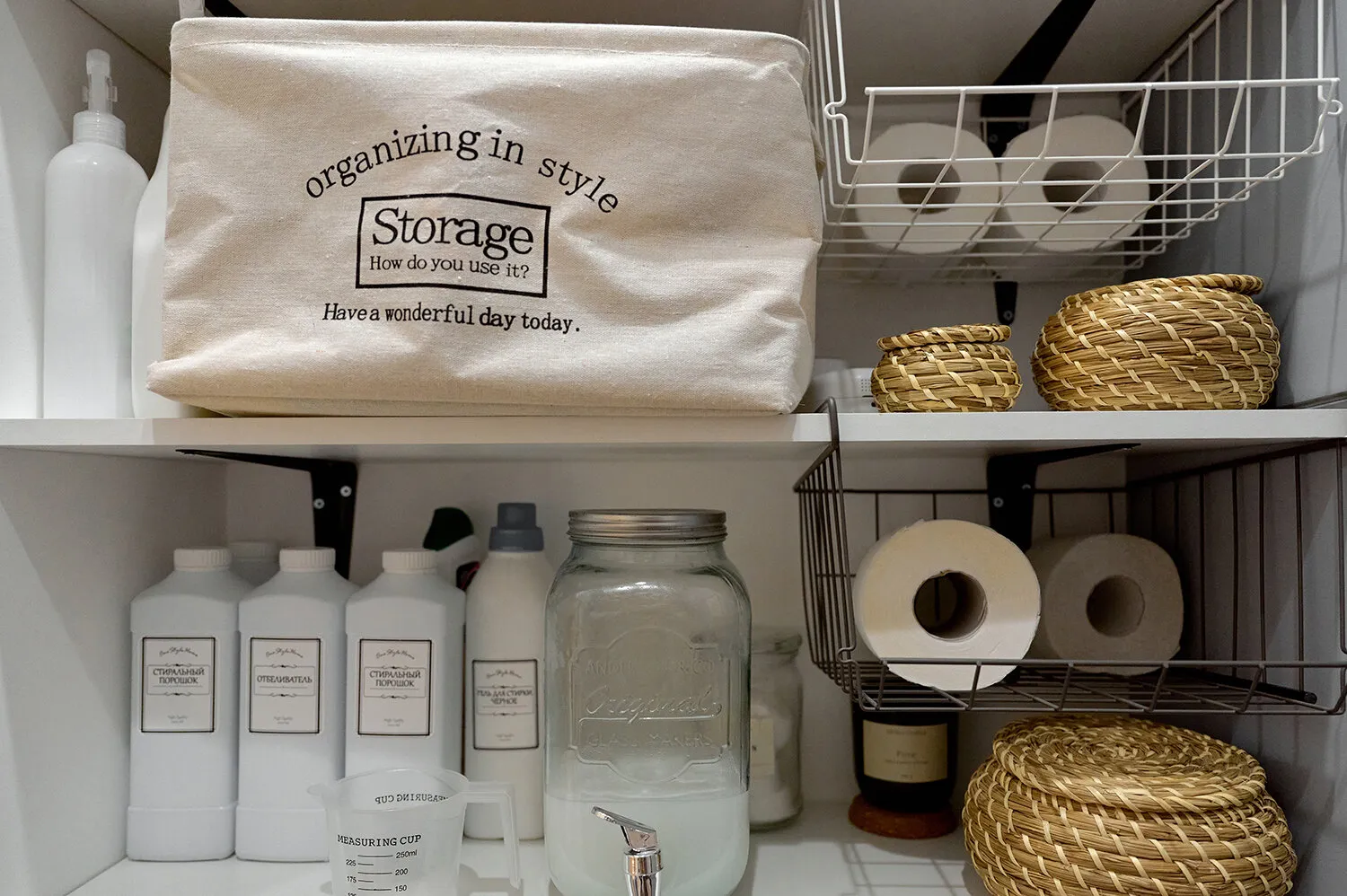 Julia compra toda la química doméstica solo en envases plásticos blancos: no importa qué sea, lo importante es que sea blanco. Esto permitió organizar un almacenamiento muy bonito en la zona de lavandería.