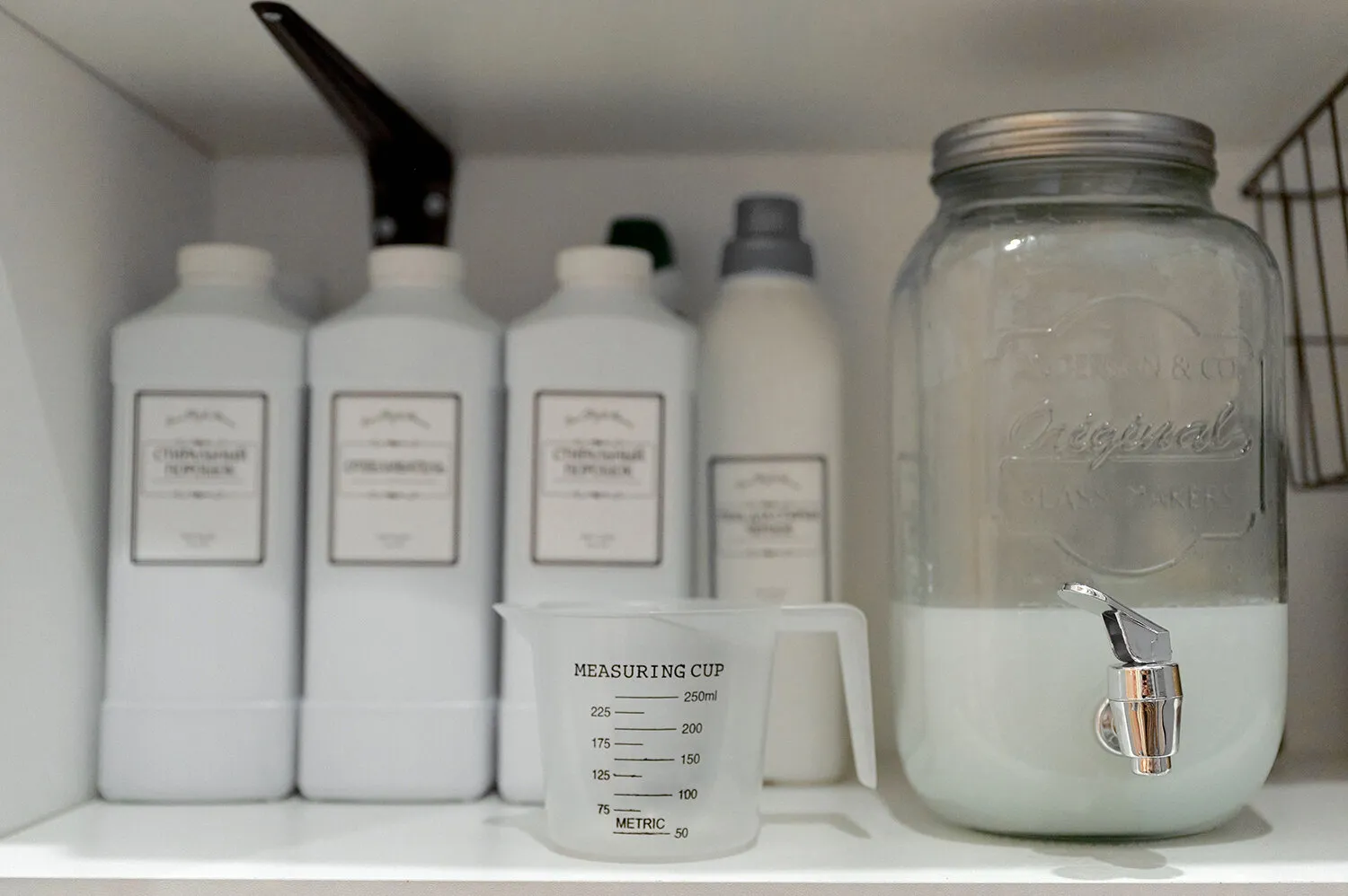En recipientes separados, nuestra heroína también vierte gel para lavar y suavizante. Aquí ideó una solución muy interesante: compró un frasco para refresco con spout y una taza medidora. Resulta muy conveniente: viertes lo que necesitas y controlas tú mismo el grifo. Un frasco lleno dura mucho tiempo.